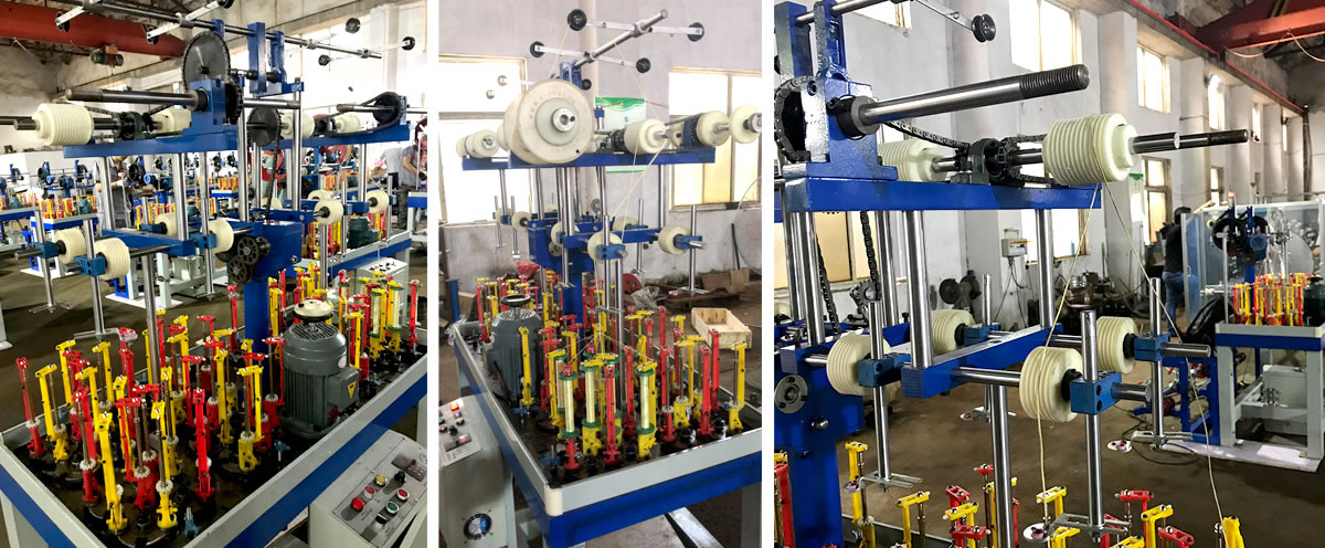 The high speed braiding machine we produce are commonly used to braid many kinds of both round and flat ropes/cords/laces (shoelaces, handbag laces, tow ropes, luggage ropes, fishing line, fiberglass sleeves, high pressure rubber hoses, decoration ropes, aerial ropes, elastic ropes, etc) and cables (high temperature wire, shielded cable, stainless steel wire braided flex hose, etc.)